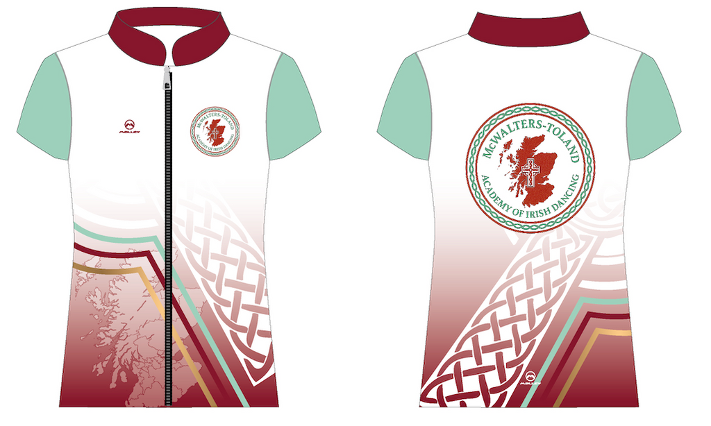 Fully Customised Irish Dance Zip Jig Top. Perfect For Feis. Short Sleeve, Collared Top with Full Zip opening.  Modern Design combined with ultimate comfort.